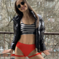 Brazyliany Flow w kolorze czerwonym z paseczkami na udach. Uszyte są z elastycznej, bardzo wygodnej i lekko połyskliwej tkaniny. Wysokość/stan – średni. Mocno eksponują i podkreślają pośladki, marszczone na pupie. Świetnie sprawdzą się do Pole Dance, ale także na plażę.