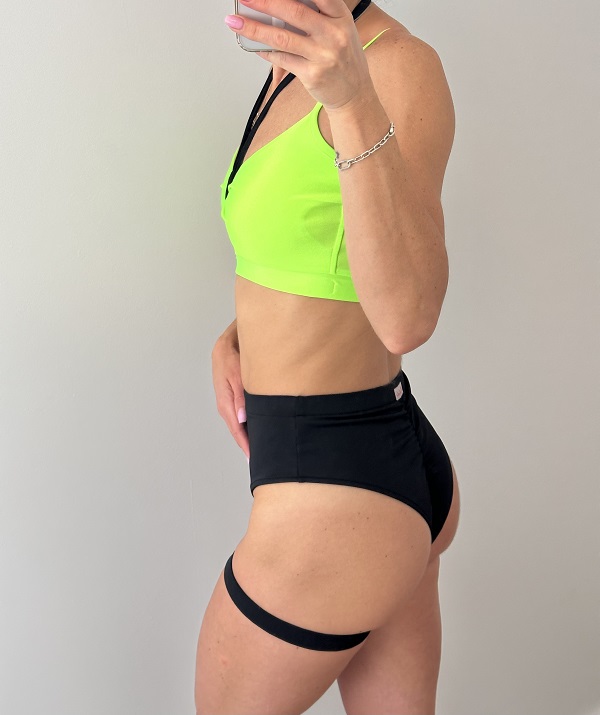 Brazyliany Silva w kolorze czarnym z szerokimi paseczkami na udach. Uszyte są z elastycznej, bardzo wygodnej i lekko połyskliwej tkaniny. Stan wysoki, podkreślający talię i wydłużający nogi. Mocno eksponują pośladki, marszczone na pupie. Świetnie sprawdzą się do Pole Dance, ale także do twerku.