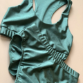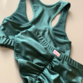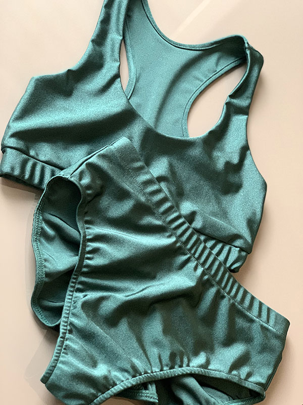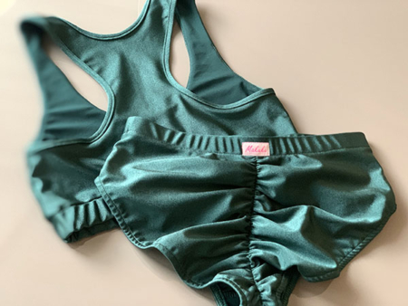 Strój do Pole Dance Boksi w kolorze zielonym/szmaragdowym. Uszyty jest z mocno elastycznej i bardzo wygodnej tkaniny. Materiał jest lekko połyskliwy. Top typu bokserka, z miejscem na wkładki. Szorty z wysokim stanem i marszczeniem na pupie. Połączenie stylu sportowego z wysokimi szortami wysmukla talię i wydłuża sylwetkę.
