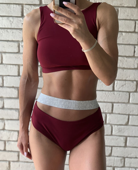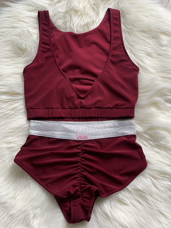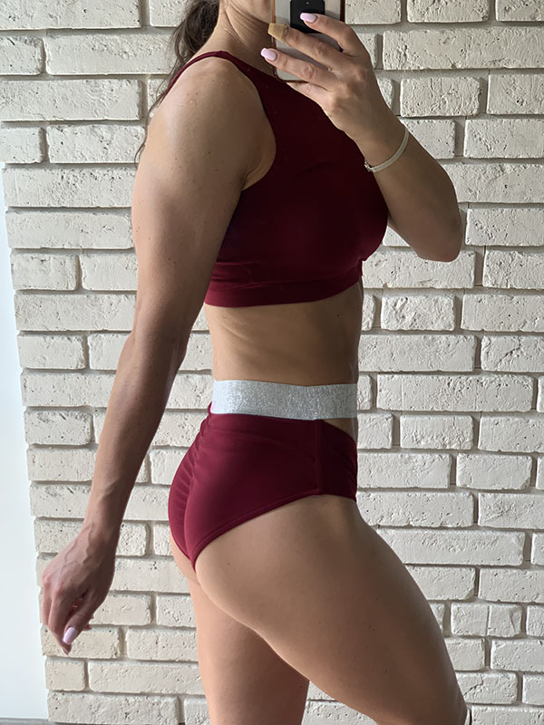 Strój do Pole Dance Cameron w kolorze bordowym. Uszyty jest z elastycznej i gładkiej tkaniny. Top zabudowany z przodu, mocno eksponuje plecy, posiada miejsce na wkładki. Szorty z ozdobnym wycięciem i srebrną gumką, marszczone na pupie.