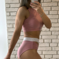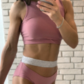 Strój do Pole Dance Cameron w kolorze pudrowego różu. Top zabudowany z przodu, mocno eksponuje plecy, posiada miejsce na wkładki. Szorty z ozdobnym wycięciem i srebrną gumką, marszczone na pupie.