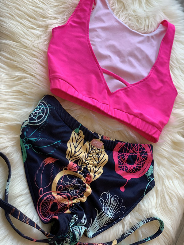 Strój do Pole Dance Catchers w kolorze różowego topu i wielokolorowego dołu. Tkanina bardzo wygodna i elastyczna, dopasowuje się do sylwetki. Top zabudowany z przodu, z tyły wycięcie w kształcie litery V z paseczkiem, posiada miejsce na wkładki. Szorty z lekko podwyższonym stanem i paseczkami na udach. Na pupie mają wszytą modelującą gumkę.  Będzie doskonałym wyborem dla każdej kobiety chcącej się wyróżnić. Doskonale leży, a jeszcze lepiej prezentuje się na żywo.