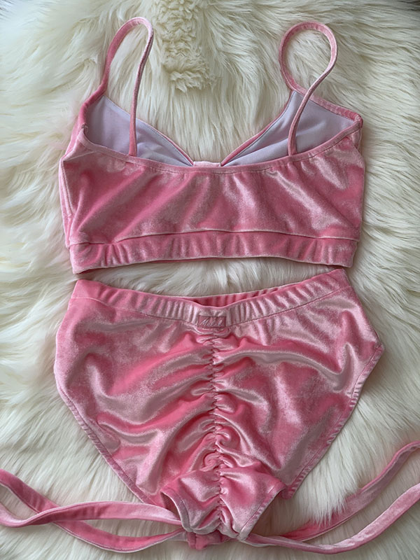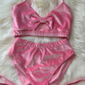Strój do Pole Dance Cleo Pink w kolorze różu barbie. Uszyty jest z elastycznego i wygodnego weluru. Bardzo kobiecy top z ozdobnym wycięciem, posiada miejsce na wkładki – polecamy maks. do miseczki C. Szorty stan lekko podwyższony z paseczkami na udach, marszczone na pupie.