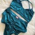 Strój Deep Turkus w kolorze turkusowym. Uszyty jest z połyskliwej tkaniny o wysokiej jakości. Włókna są mocno elastyczne. Top ma cienkie ramiączka ułożone na krzyż na plecach. Z przodu ozdobne wycięcie, wewnątrz z miejscem na wkładki. Szorty z wyższym stanem i ozdobnym wycięciem, zakrywają 3/4 pośladków. Na pupie mają wszytą modelującą gumkę. Całość prezentuje się bardzo efektownie, a głęboki turkus dodaje uroku. Komplet przepięknie prezentuje się na żywo.
