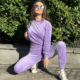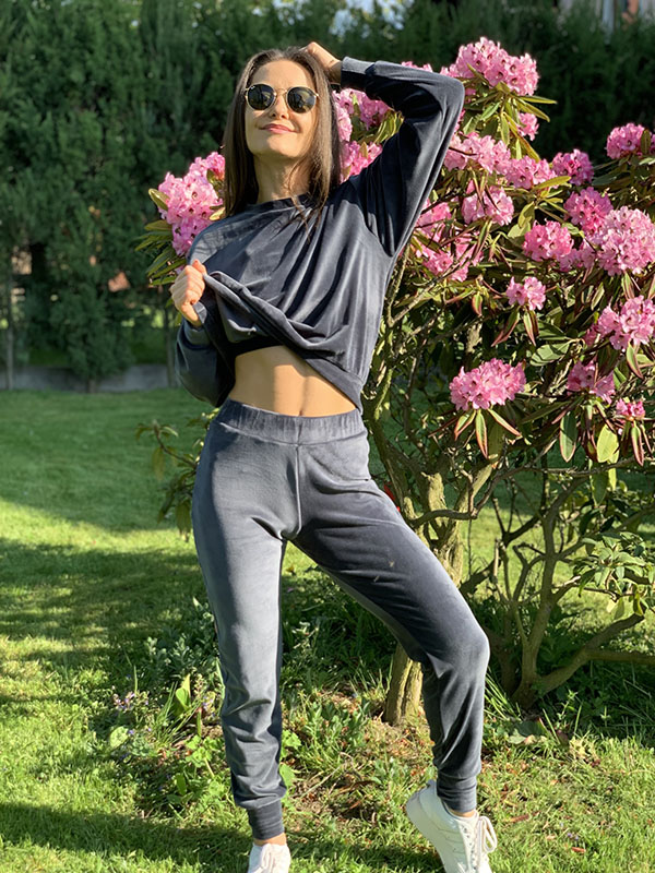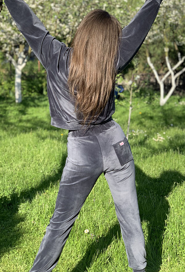 Komplet dresowy Velvet Class w kolorze grafitowym. Uszyty z bardzo przyjemnego i miękkiego weluru. Bluza średniej długości oraz spodnie z wyższym stanem i ściągaczami na nogawkach. Przyda się w każdej kobiecej szafie.