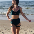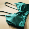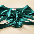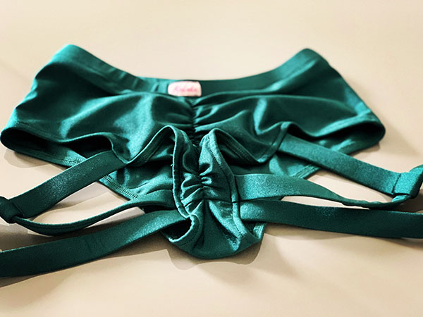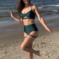 Strój Kolumbia w kolorze zielonym. Top na cienkich ramiączkach z ozdobną kokardką i wycięciem. Posiada wkładki w zestawie. Szorty brazyliany z podwyższonym stanem i ozdobnymi paseczkami na udach i pośladkach, marszczone na pupie. Strój prezentuje się bardzo efektownie, idealny dla kobiet lubiących się wyróżnić. Tkanina mocno elastyczna, z lekkim połyskiem.