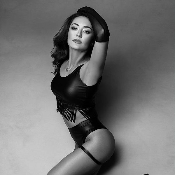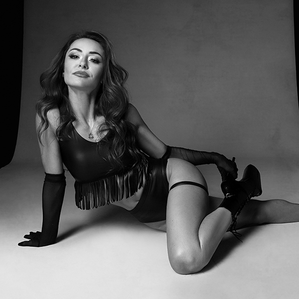 Strój La Viva w kolorze czarnym. Uszyty jest z elastycznego materiału przypominającego skórę. Top na szerokich ramiączkach zdobiony frędzlami, wewnątrz ma miejsce na wkładki. Szorty typu brazyliany, mocniej wycięte i marszczone na pupie, zdobione paseczkami na udach. Całość jest bardzo wygodna. Strój idealny do Pole Dance, do sesji zdjęciowych oraz na scenę teatralną. Nietuzinkowy i wyróżniający się fason.