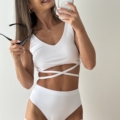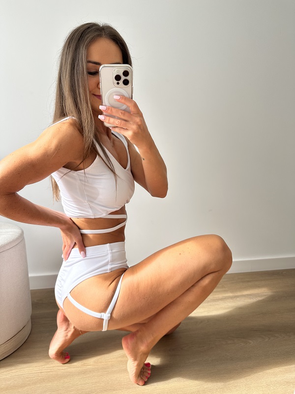 Strój Lajla w kolorze białym. Uszyty jest z mocno elastycznej tkaniny, która dopasowuje się do sylwetki. Top na szerszych ramiączkach z dekoltem w kształcie litery V i mocno wyciętymi plecami. Jego ozdobą są cienkie paseczki – wewnątrz posiadają gumki, dzięki temu są mocno rozciągliwe i nie wrzynają się. Top posiada miejsce na wkładki. Szorty typu brazyliany z podwyższonym stanem, zdobione paseczkami na udach i po bokach. Paseczki szerokością współgrają z topem. Szorty pięknie eksponują pośladki i podkreślają talie, dodatkowo mają wszytą modelująca gumką na pupie. Komplet jest bardzo efektowny, będzie świetnym wyborem dla każdej kobiety chcącej się wyróżnić. Doskonale leży, a jeszcze lepiej prezentuje się na żywo.
