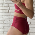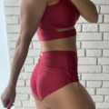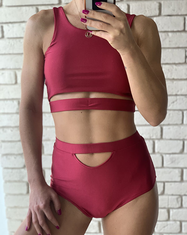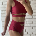 Strój do Pole Dance Larisa w kolorze bordowym. Uszyty jest z mocno elastycznej i wygodnej tkaniny. Materiał lekko połyskliwy. Top zabudowany z delikatnym wycięciem pod biustem, posiada miejsce na wkładki. Szorty z wysokim stanem i ozdobnym wycięciem, marszczone na pupie.