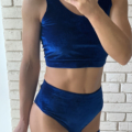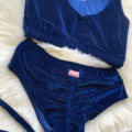 Strój Lejdi w kolorze chabrowym. Uszyty jest z elastycznego i wygodnego weluru. Top na szerokich ramiączkach z dekoltem w serek, posiada miejsce na wkładki. Szorty typu brazyliany z podwyższonym stanem i marszczeniem na pupie, dodatkowo posiadają paseczki na udach. Sprawdzi się na każdy rodzaj sylwetki.