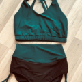 Strój Madera w kolorze czarno-zielonym. Uszyty z bardzo elastycznej, wygodnej i gładkiej tkaniny. Top z trzema paseczkami na plecach, wewnątrz posiada miejsce na wkładki, dobrze trzyma biust. Szorty z wysokim stanem, bezszwowe w pasie, z ozdobnym wiązaniem po bokach, modelują talię. Set świetnie sprawdza się dla kobiet chcących zakryć brzuszek.