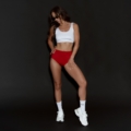 Strój do Pole Dance Mandala w kolorze biało-czerwonym. Uszyty jest z mocno elastycznej i wygodnej tkaniny. Tkanina delikatnie połyskliwa. Top w klasycznym stylu, na szerokich ramiączkach z wyciętym dekoltem i wyciętymi plecami, posiada miejsce na wkładki. Szorty z wyższym stanem, bezszwowe w pasie. Idealne dla osób, które źle się czują z gumką w pasie. Dodatkowo posiadają marszczenie na pupie. Zakrywają większą część pośladków.