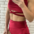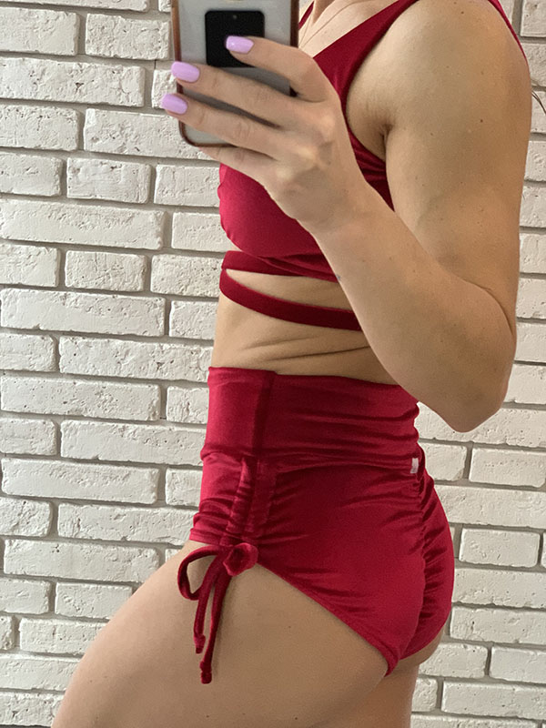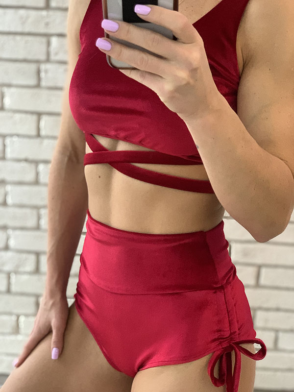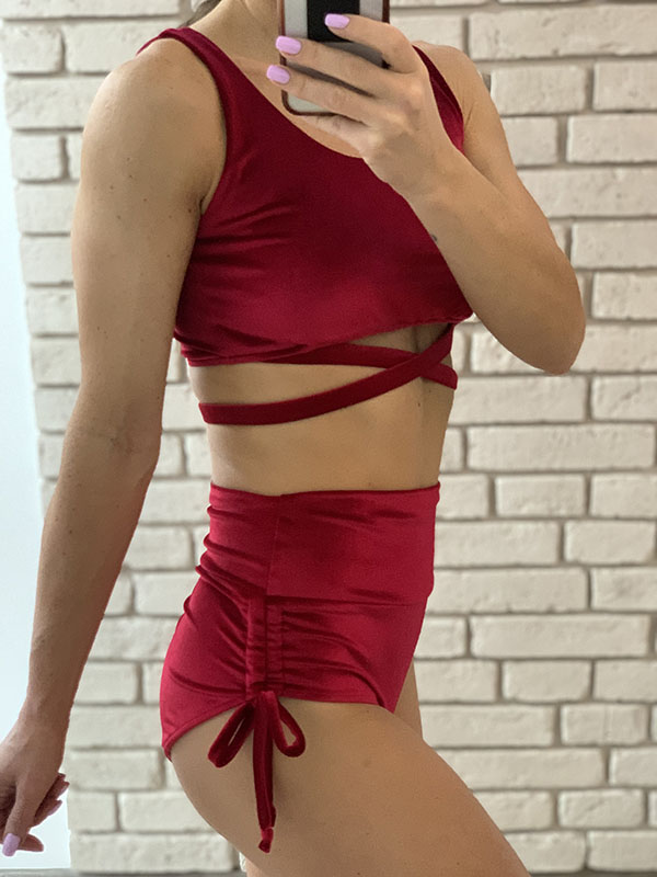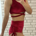 Strój do Pole Dance Miracle w kolorze czerwonym. Uszyty jest z wygodnego i elastycznego weluru. Top z ozdobnymi paseczkami pod biustem, posiada miejsce na wkładki. Szorty z wysokim stanem, bezszwowe w pasie, z ozdobnymi wiązaniami po bokach, marszczone na pupie. Idealne dla kobiet chcących zakryć brzuch.