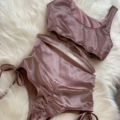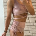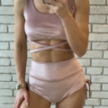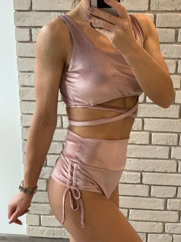 Strój do Pole Dance Mirror w kolorze różowym-pudrowym. Uszyty jest z wygodnego i elastycznego weluru. Top z ozdobnymi paseczkami pod biustem, posiada miejsce na wkładki. Szorty mocno wycięte na pupie z wysokim stanem, bezszwowe w pasie, z ozdobnymi wiązaniami po bokach, marszczone na pupie. Idealne dla kobiet chcących zakryć brzuch.