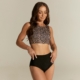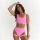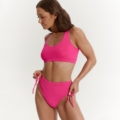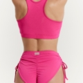 Strój do Pole Dance Rodos w kolorze różowym. Uszyty jest z mocno elastycznej i wygodnej tkaniny. Materiał jest gładki. Top z wyciętym dekoltem, tył typu bokserka, posiada miejsce na wkładki. Szorty z wyższym stanem, wydłużające nogi. Po bokach mają ściągacze z wiązaniami do regulacji. Na pupie marszczenie.