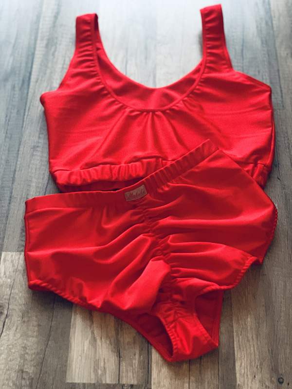 Strój Roma w kolorze czerwonym. Uszyty z elastycznej i lekko połyskliwej tkaniny. Top z dekoltem w serek, posiada miejsce na wkładki. Szorty z wysokim stanem i marszczeniem na pupie. Klasyczny i bardzo uniwersalny fason. Sprawdzi się na każdy rodzaj kobiecej sylwetki i zasłoni brzuch.