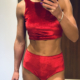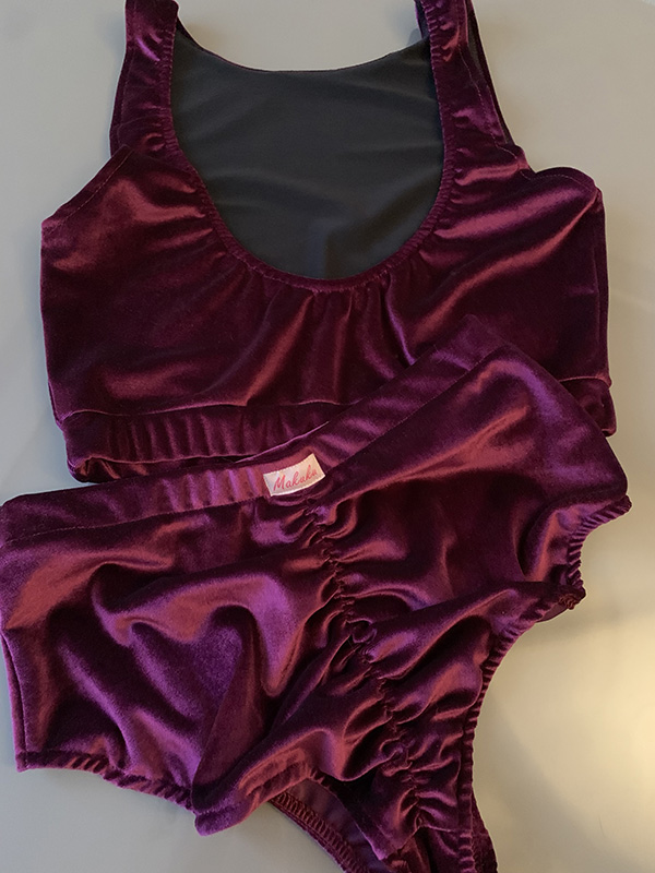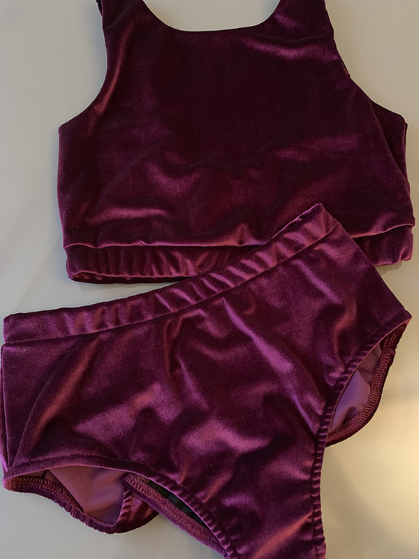 Strój do Pole Dance Victoria w kolorze śliwkowym. Uszyty jest z wygodnego i elastycznego weluru. Top mocno zabudowany z przodu, z mocno odsłoniętymi plecami, posiada miejsce na wkładki. Szorty klasyczne z podwyższonym stanem, marszczone na pupie.