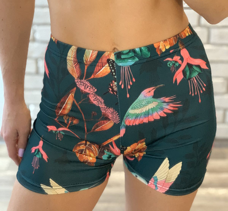 Wielokolorowe spodenki Birds. Uszyte są z elastycznej i lekko połyskliwej tkaniny z dodatkiem siateczki. Na pupie mają wszytą modelującą gumkę. Idealnie sprawdzą się do exotica.