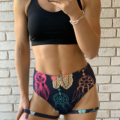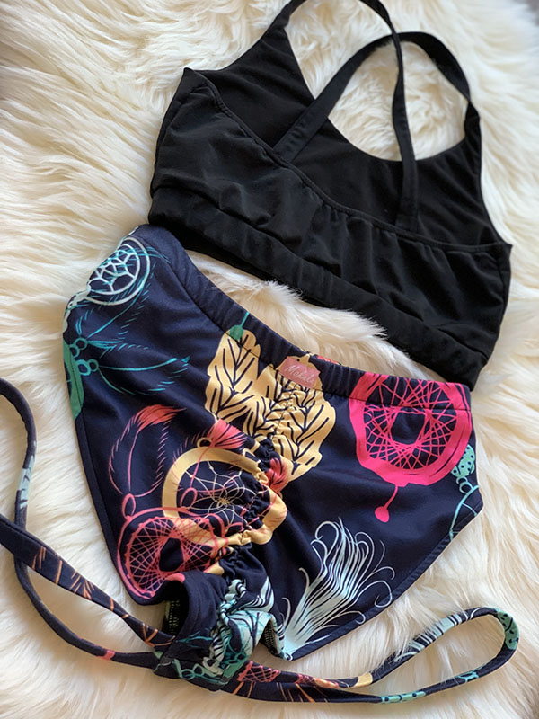Wielokolorowe szorty Dream Catchers uszyte są z elastycznej i bardzo wygodnej tkaniny. Idealnie podkreślają kobiece kształty. Tkanina gładka w piękne wzory łapacze snów. Stan lekko podwyższony z paseczkami na udach, na pupie marszczenie.