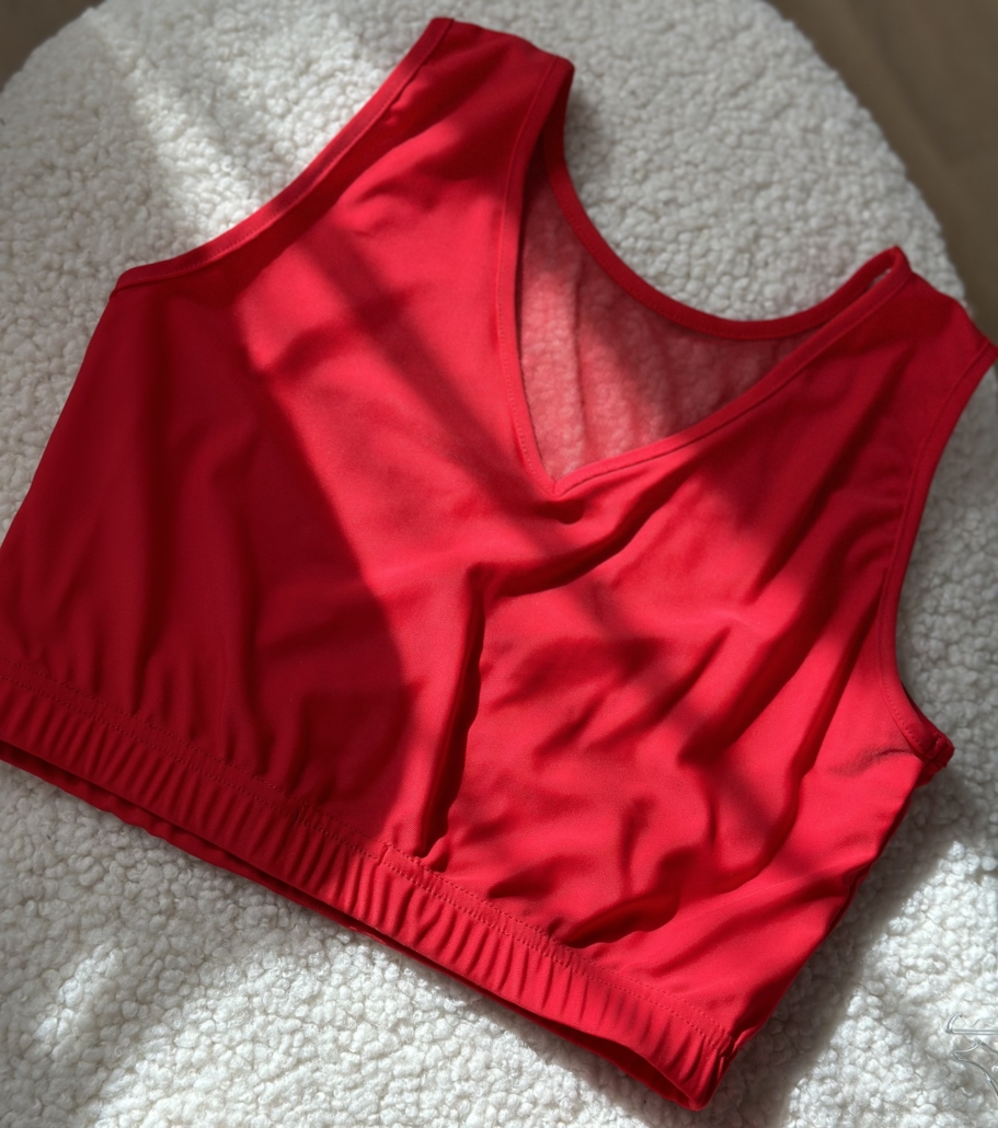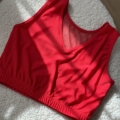 Top Rosalie w kolorze czerwonym. Uszyty jest z mocno elastycznej i wygodnej tkaniny. Top zabudowany z przodu z ozdobną siateczką na dekolcie w kształcie litery V, wewnątrz jest miejsce na wkładki. Plecy w topie są zakryte. Top występuje w komplecie z szortami – Strój Rosalie Red.